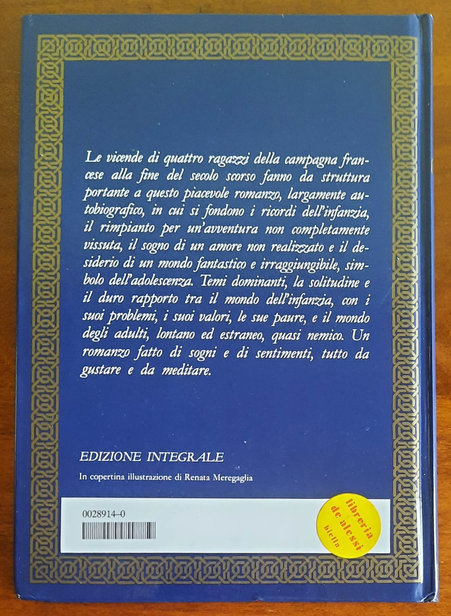 Le vicende di quattro ragazzi della campagna francese alla fine del secolo scorso fanno da struttura portante a questo piacevole romanzo, largamente autobiografico, in cui si fondono i ricordi dell’infanzia, il rimpianto per un’avventura non completamente vissuta, il sogno di un amore non realizzato e il desiderio di un mondo fantastico e irraggiungibile, simbolo dell’adolescenza. Temi dominanti, la solitudine e il duro rapporto tra il mondo dell’infanzia, con i suoi problemi, i suoi valori, le sue paure, e il mondo degli adulti, lontano ed estraneo, quasi nemico. Un romanzo fatto di sogni e di sentimenti, tutto da gustare e da meditare.