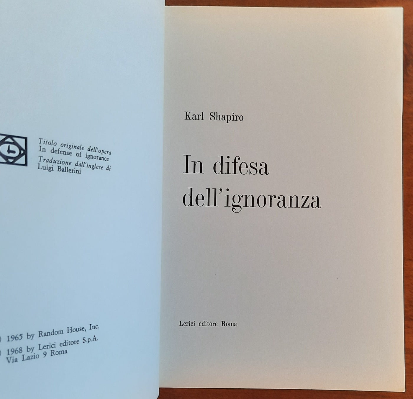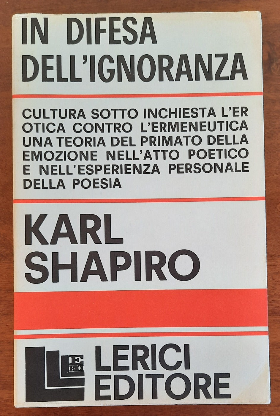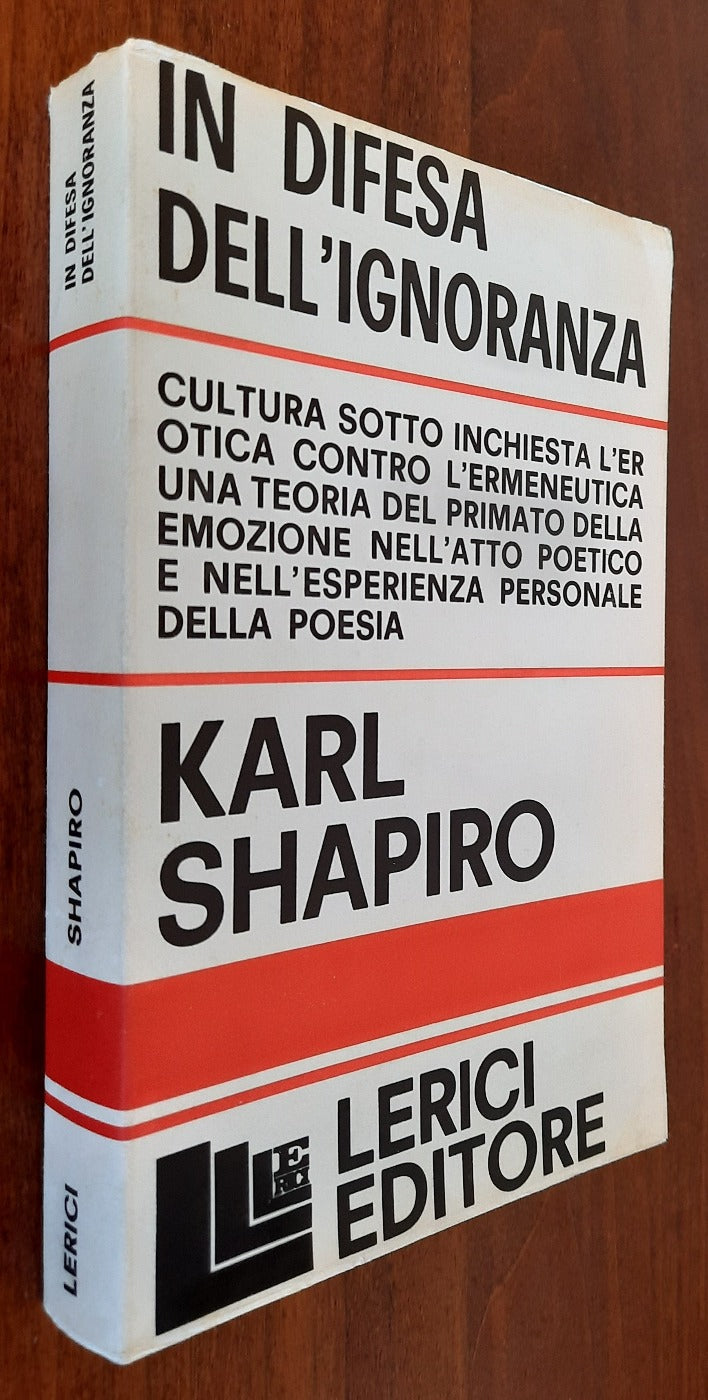 Si può dire che ’’ In difesa dell’ignoranza ’’ sia un manuale poetico dell’altra America. Tra intemperanze umane e audacie interpretative l’autore propone una teoria dell’intensità emotiva nell’atto della creazione e della fruizione estetica. Nell’indicare Whitman, D. H. Lawrence e William Carlos Williams come portabandiera dell’alternativa, Karl Shapiro individua nell’esperienza personale, anzichè in quella della cultura ufficiale, il dato oggettivo del divenire poetico e intende quest’attività come conoscenza della realtà ottenuta con mezzi semantici per nulla dipendenti dalle condizioni storiche ereditate da chi scrive.