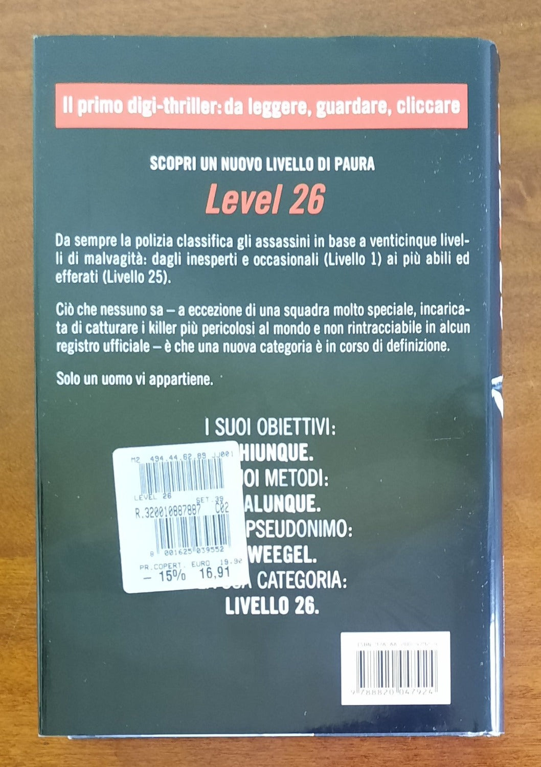 Level 26 ha per protagonista Steve Dark, il massimo esperto nell’analisi della scena del crimine, sulle tracce di un assassino tanto efferato che la polizia ha istituito una nuova classificazione appositamente per lui. Level 26 è un thriller come tutti gli altri: lo si può leggere in spiaggia o in aereo... ma là dove la storia tradizionale termina, ci si può immergere a un livello più profondo su www.level26.com, riservato esclusivamente ai lettori del libro. Ogni venti pagine circa, si avrà la possibilità di effettuare l’accesso a un cyber-bridge: un filmato di tre minuti con attori di fama internazionale. I personaggi prenderanno vita, i particolari della scena del crimine balzeranno fuori dal monitor, e il sito web potrebbe persino chiedere un numero di telefono al quale l’assassino possa contattare personalmente il lettore.